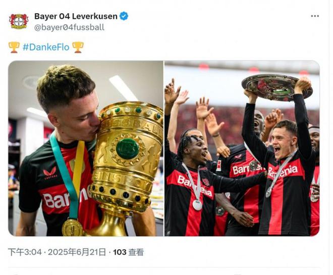 勒沃库森社媒今早晒维尔茨与奖杯合照,继续与他告别